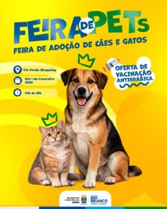 A Prefeitura de Rio Branco, por meio da Secretaria Municipal de Saúde, realizará neste domingo (1º) a Feira de Adoção de Pets, com foco na adoção responsável de cães e gatos e na promoção da saúde animal. A ação ocorrerá das 14h às 19h, no Via Verde Shopping.